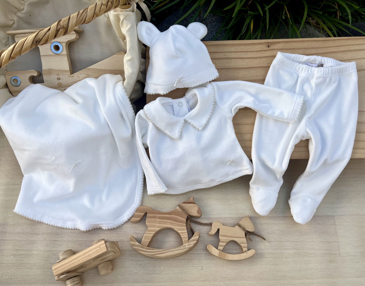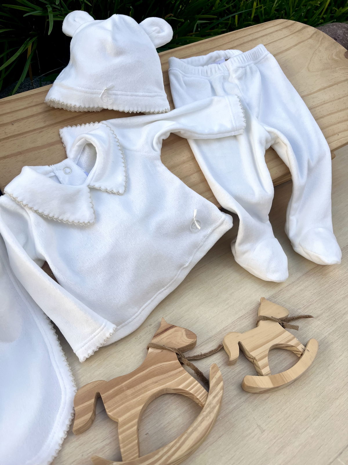 Ajuar Plush doble pelo, es decir en una prenda que tiene frisa en su interior: ideal para bebes nacidos en INVIERNO. Su textura Soft hace que la prenda sea súper suable y blandita para el bebé