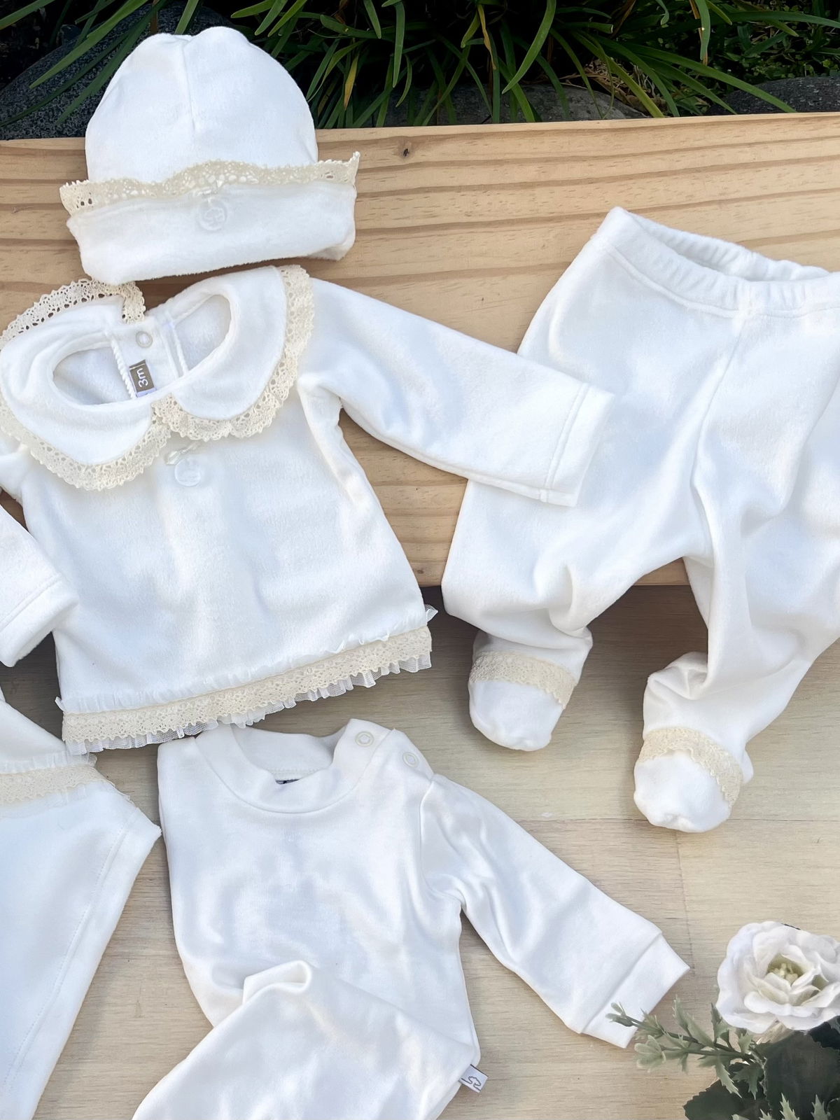 Ajuar Plush doble pelo, es decir en una prenda que tiene frisa en su interior: ideal para bebes nacidos en INVIERNO. Su textura Soft hace que la prenda sea súper suable y blandita para el bebé