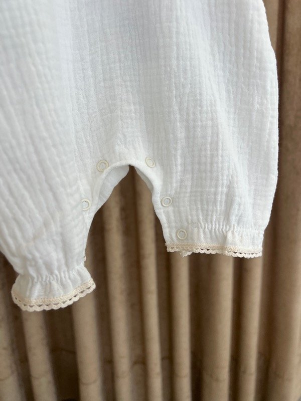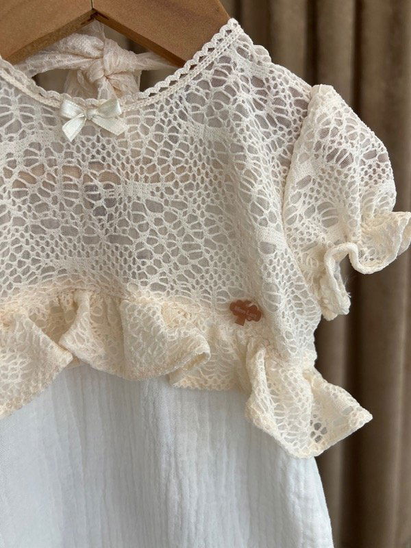 Gasa de algodon con encaje en pechera. Espalda con nudo para hacer lazo. Pañalera