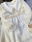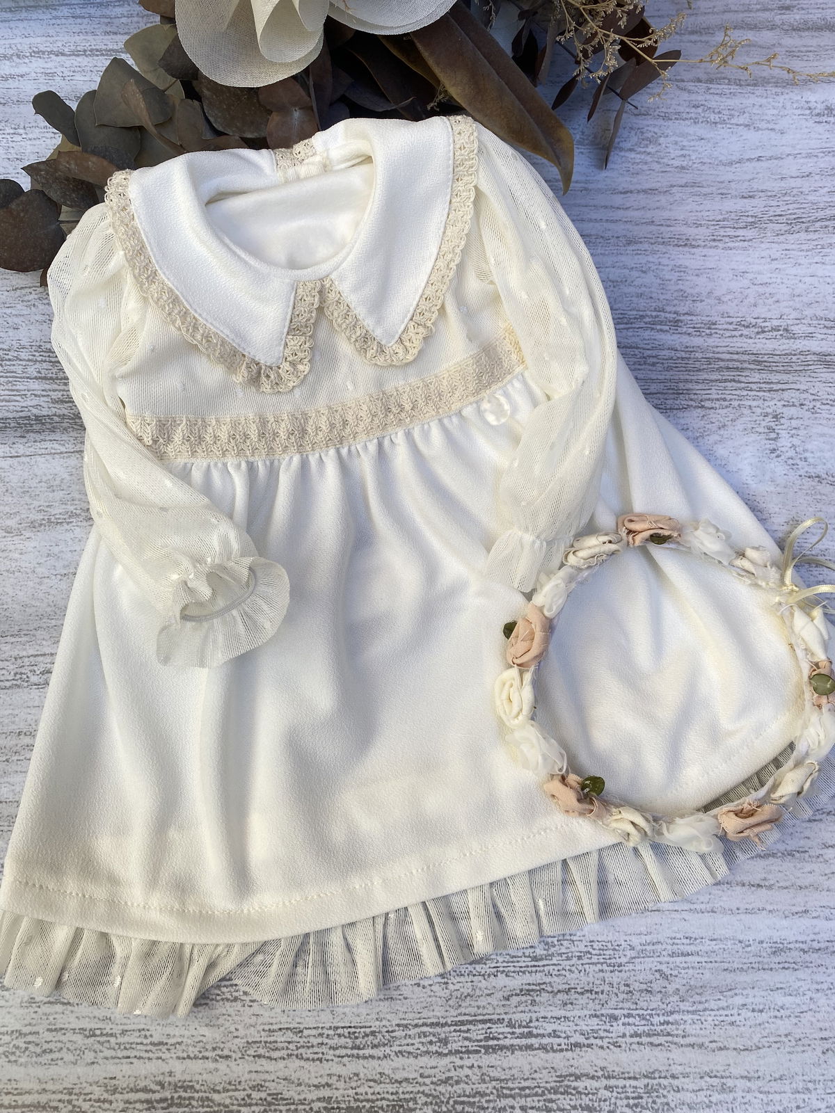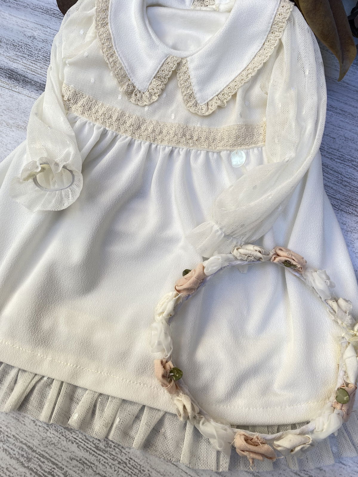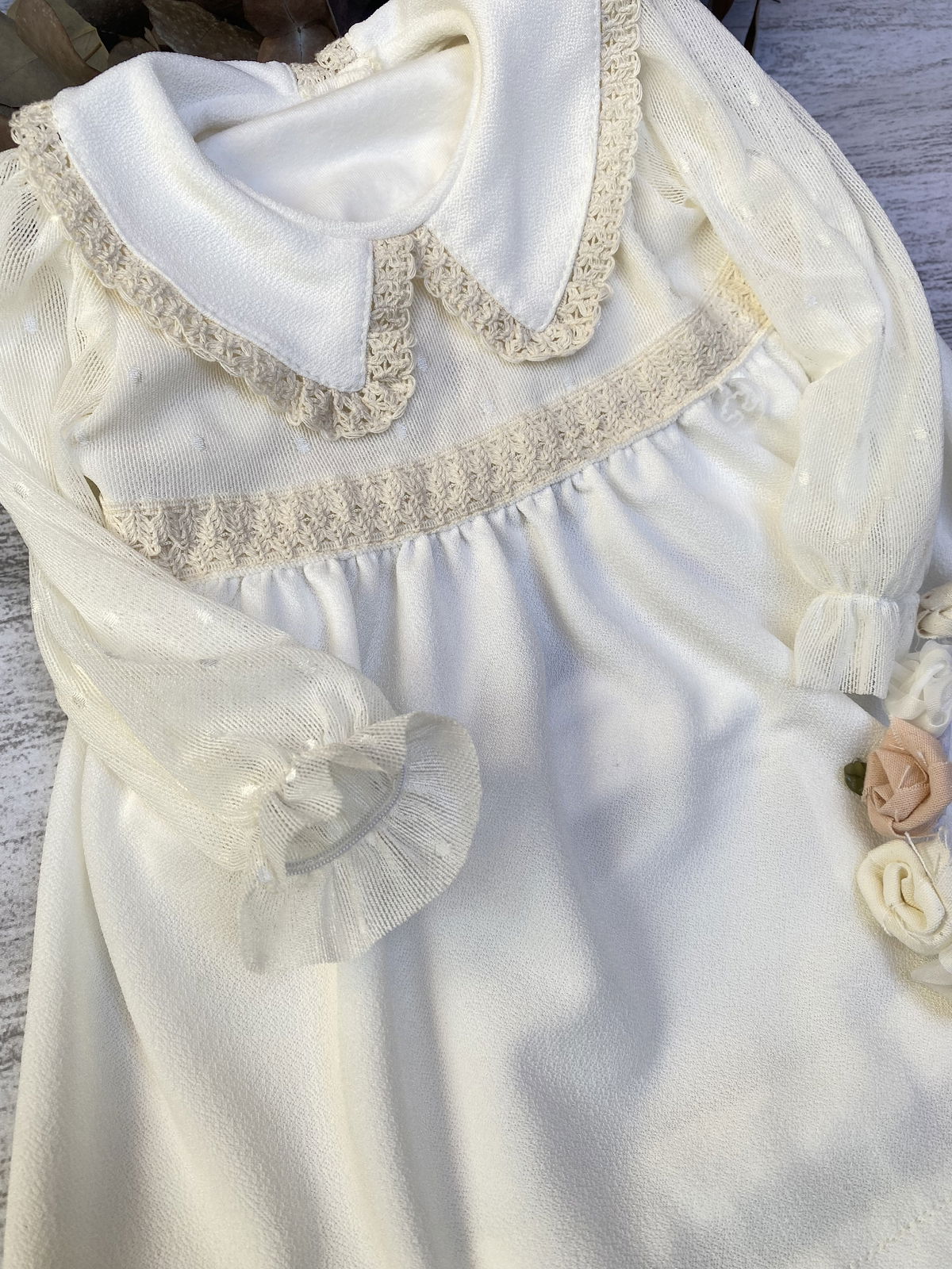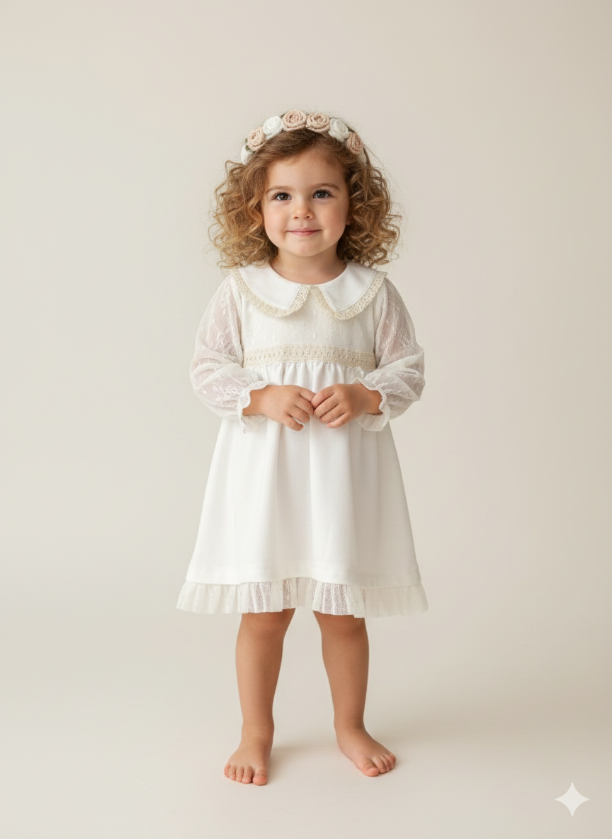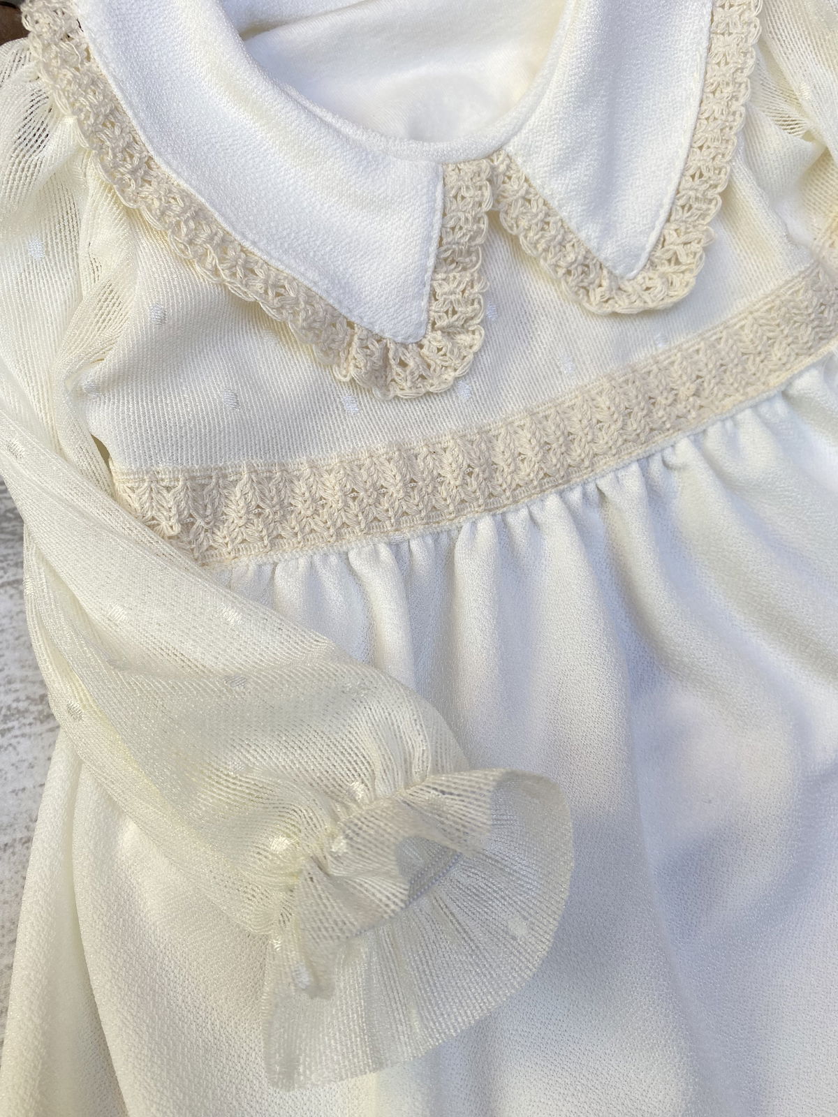 Tela de crepe blanco con tull de plumeti y detalles en puntilla en el cuello triangular