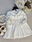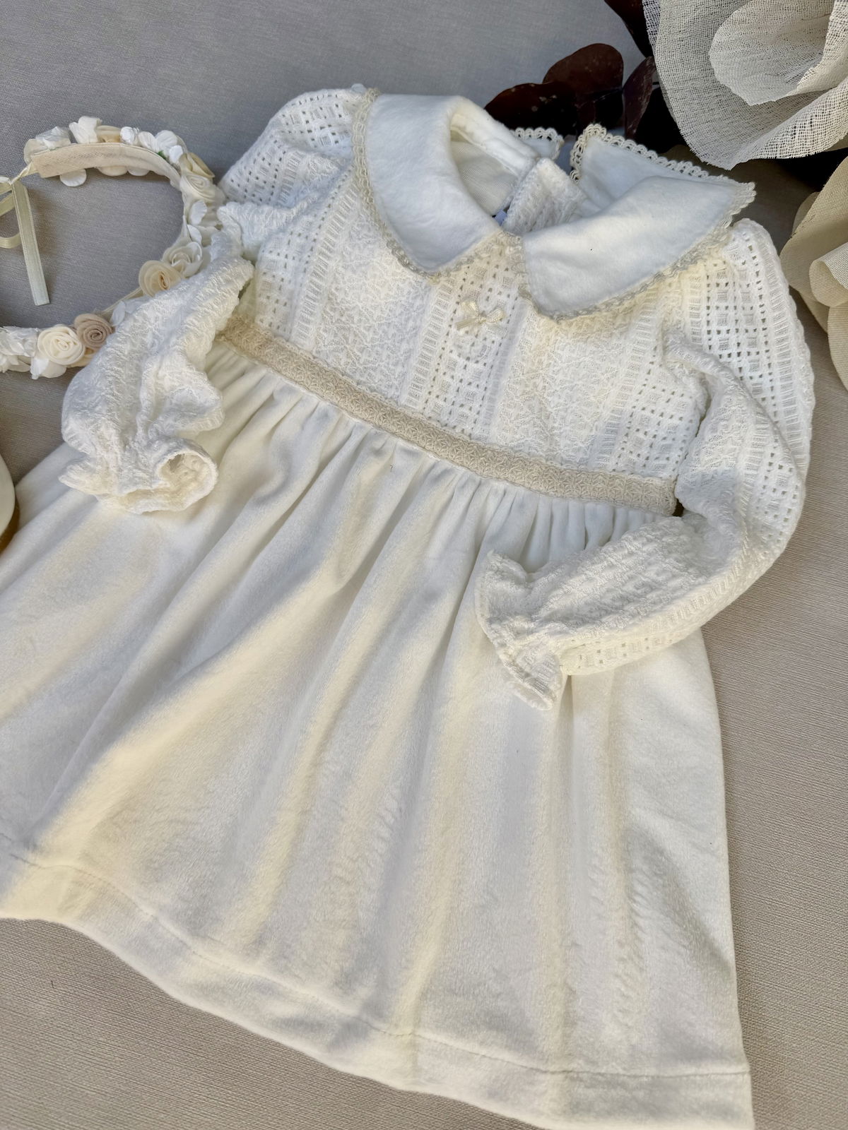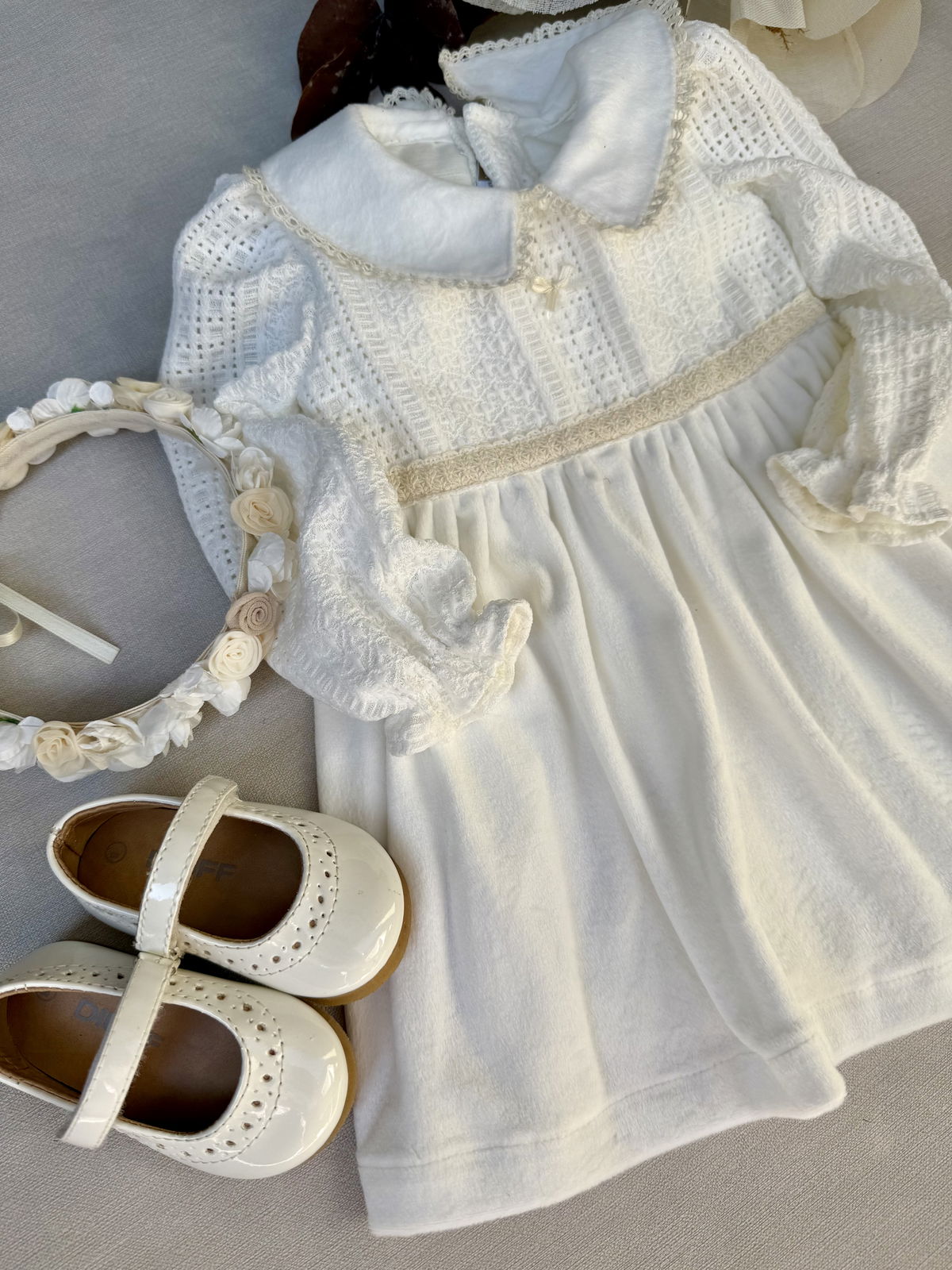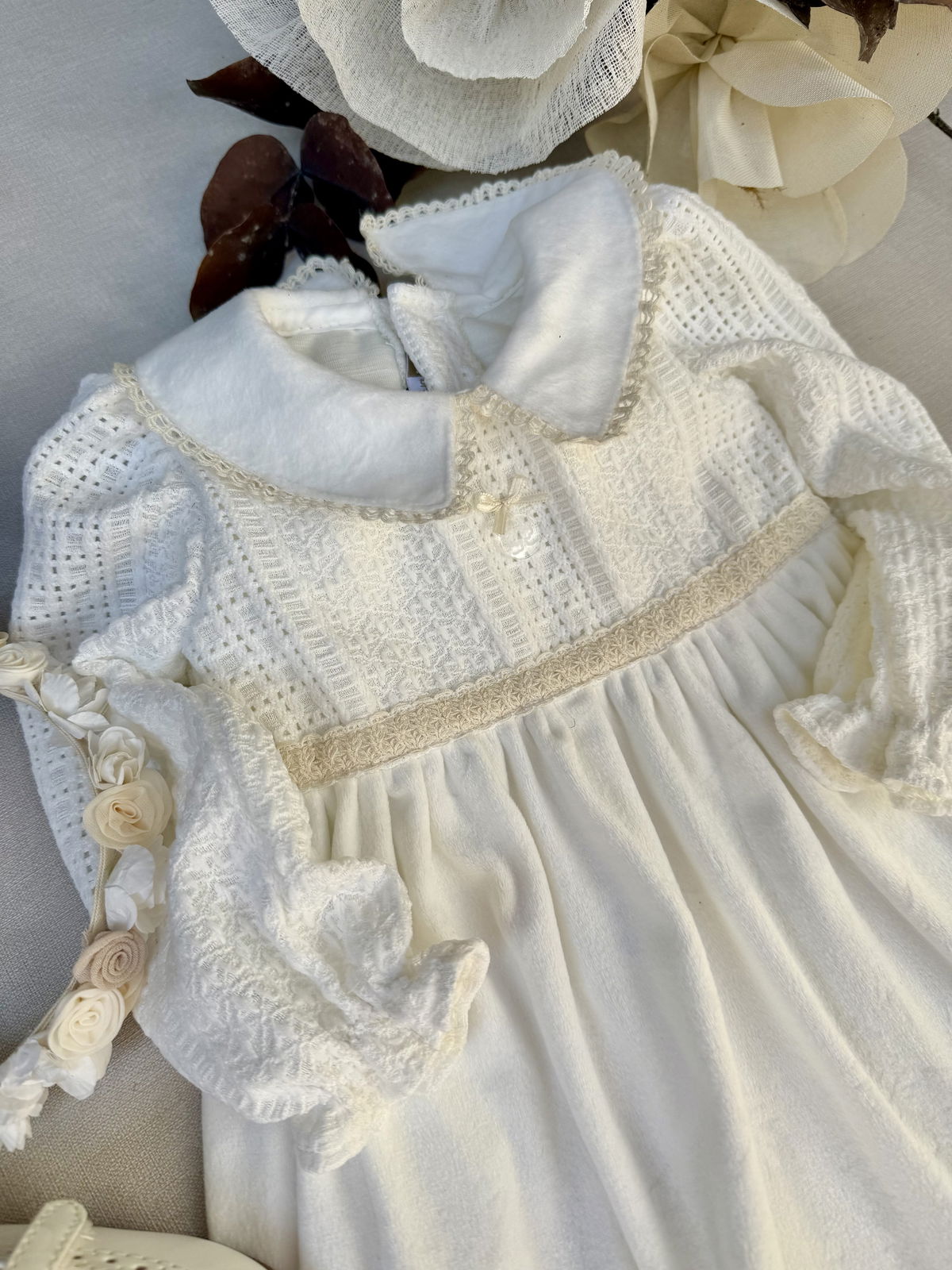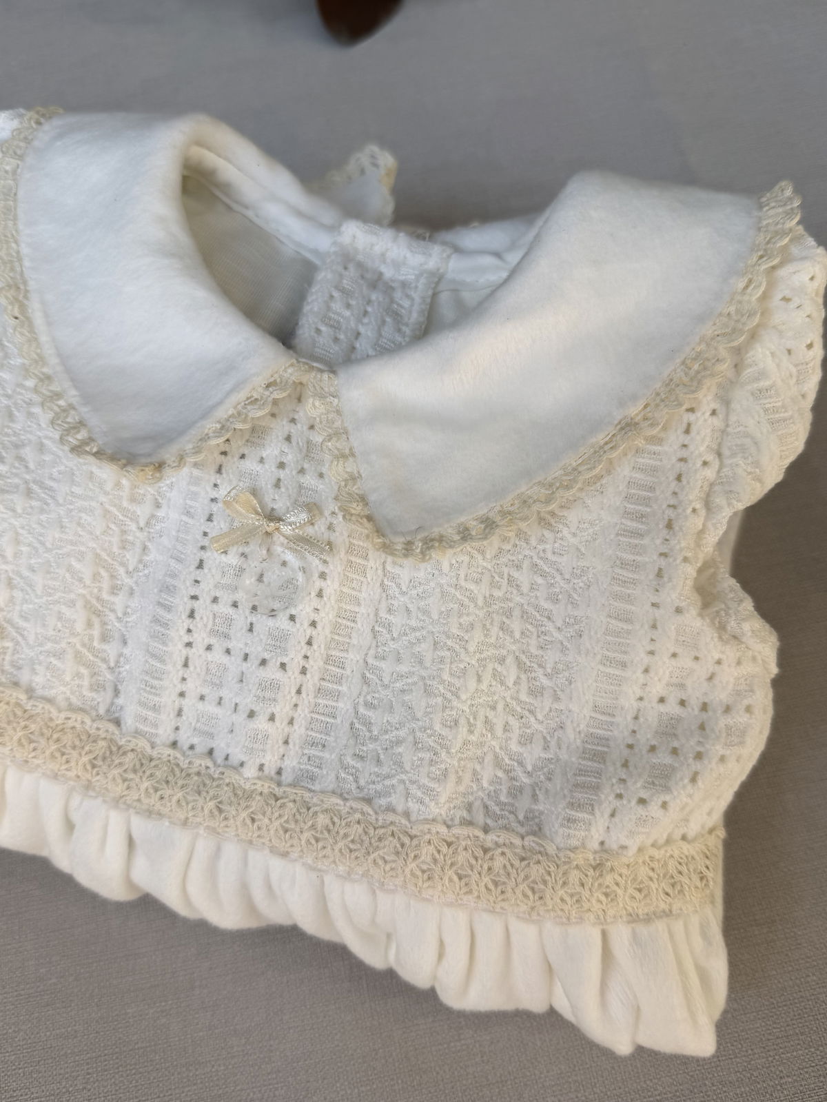 Plush doble pelo, con frisa en su interior. Delicada pechera de broderie tramado con detalles en puntillas