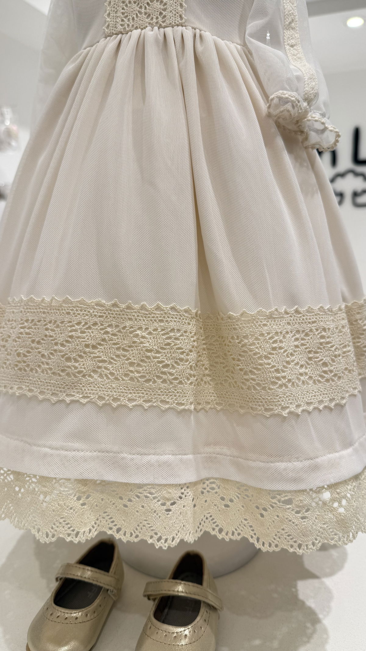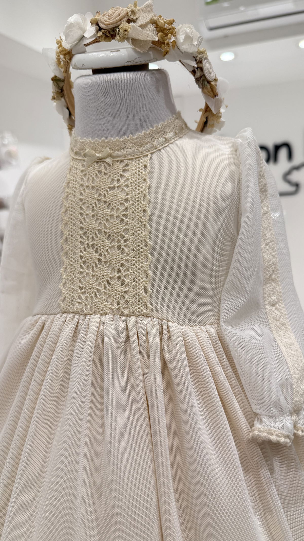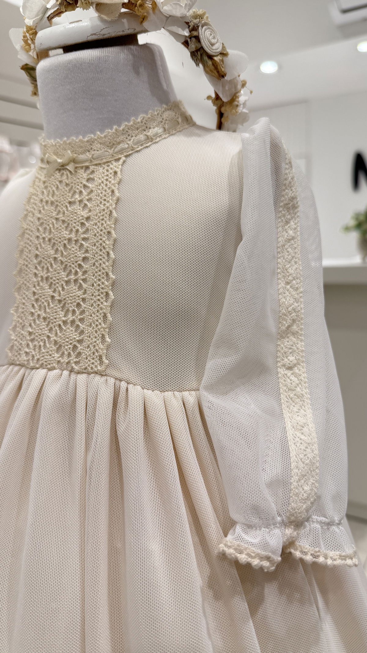 Vestido de microtull con detalles en puntillas, mangas 3/4 con una hermosa capota haciendo juego