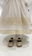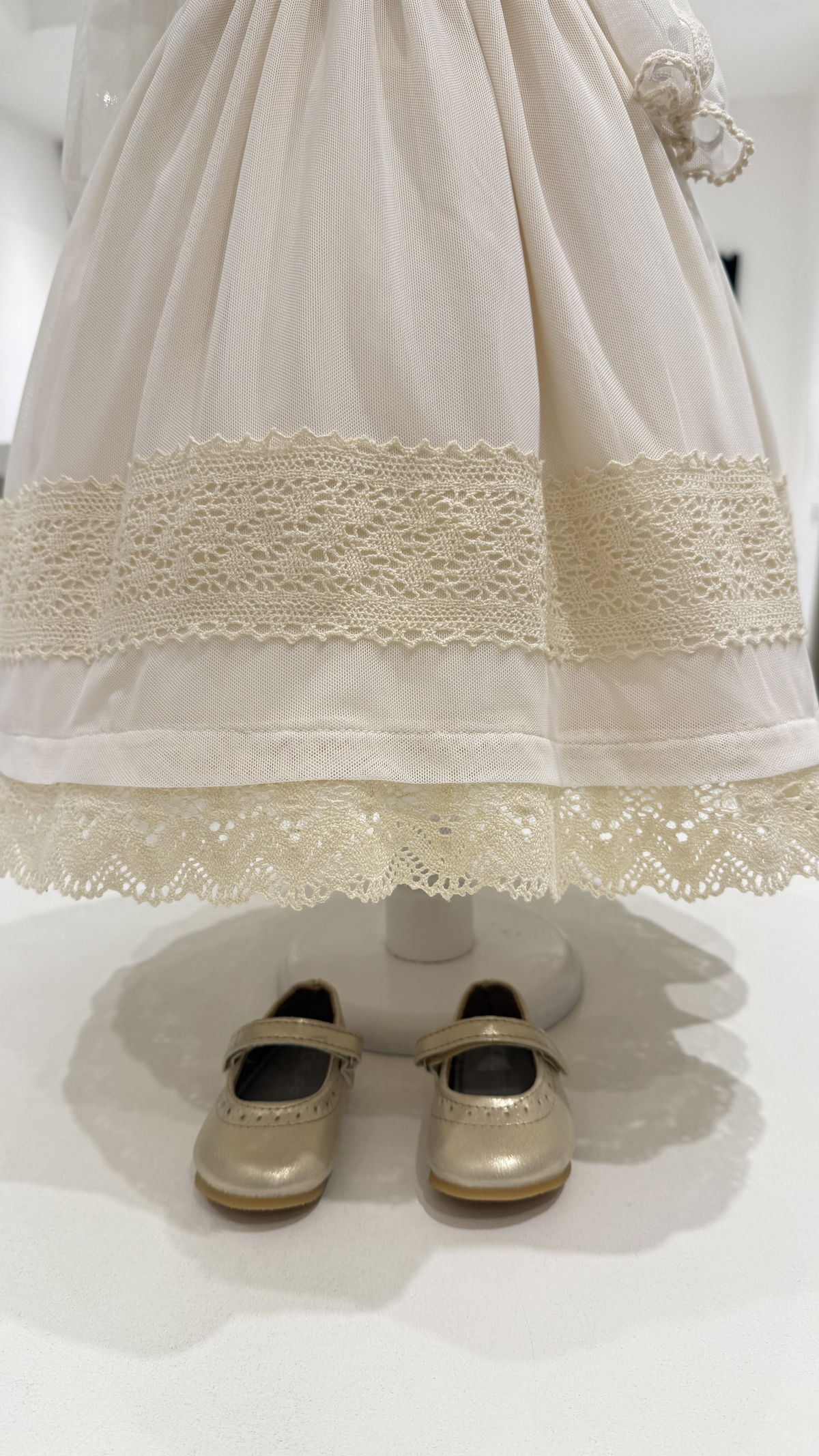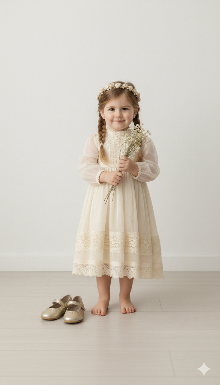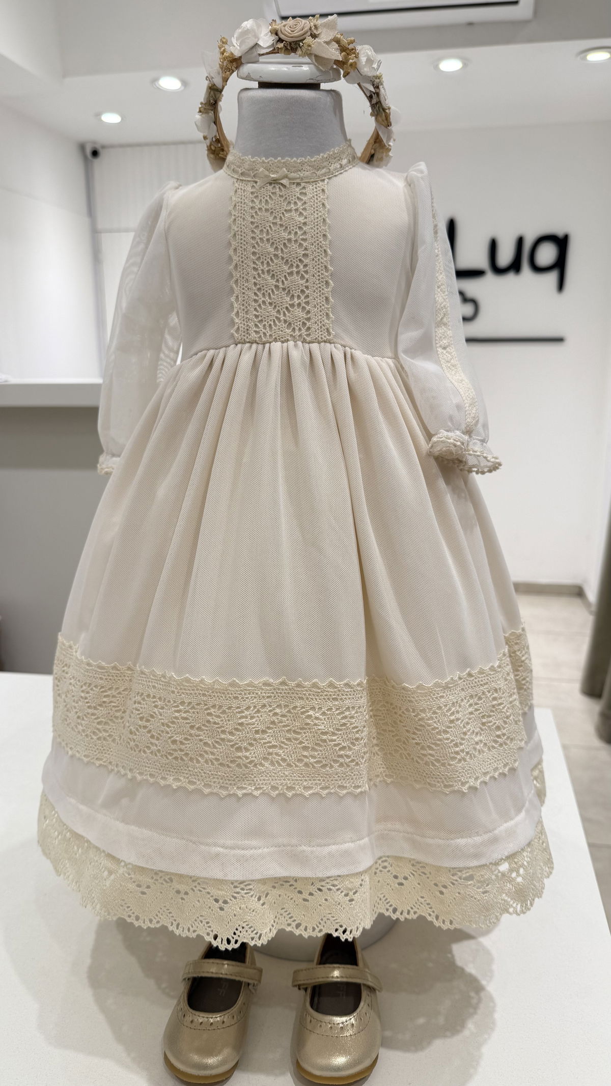 Vestido de microtull con detalles en puntillas, mangas 3/4 con una hermosa capota haciendo juego