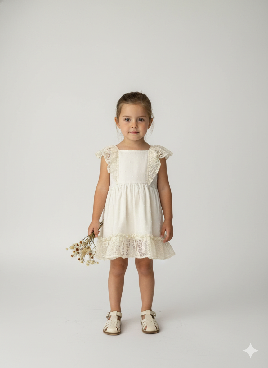 Solera de plumeti color natural con breteles y vuelos en encaje