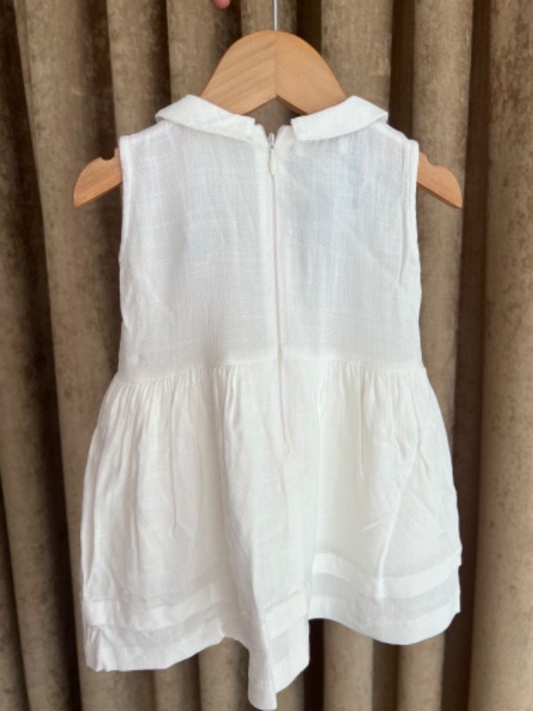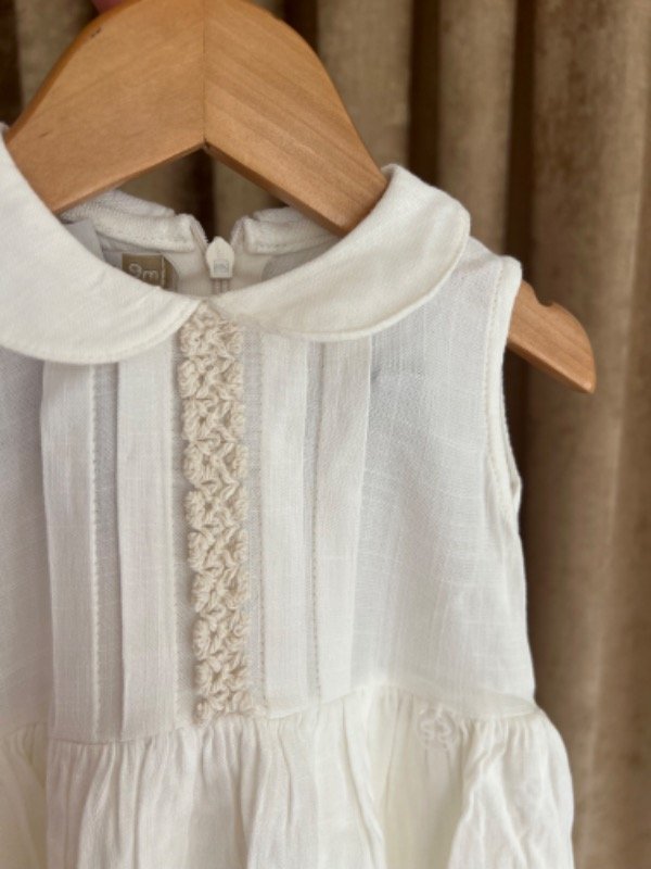 Vestido de lino color natural con cuello baby y un delicado tableado en su pechera