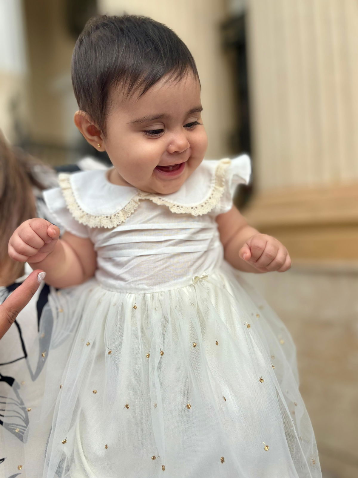 Vestido de voaile de algodón con falda de tull con destellos dorados, cuello baby