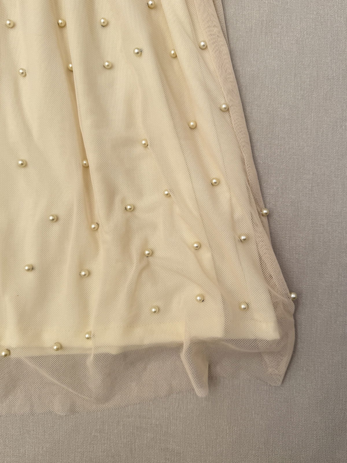 Vestido perlas beige de microtull con pechera de encaje y delicadas perlas al tono
