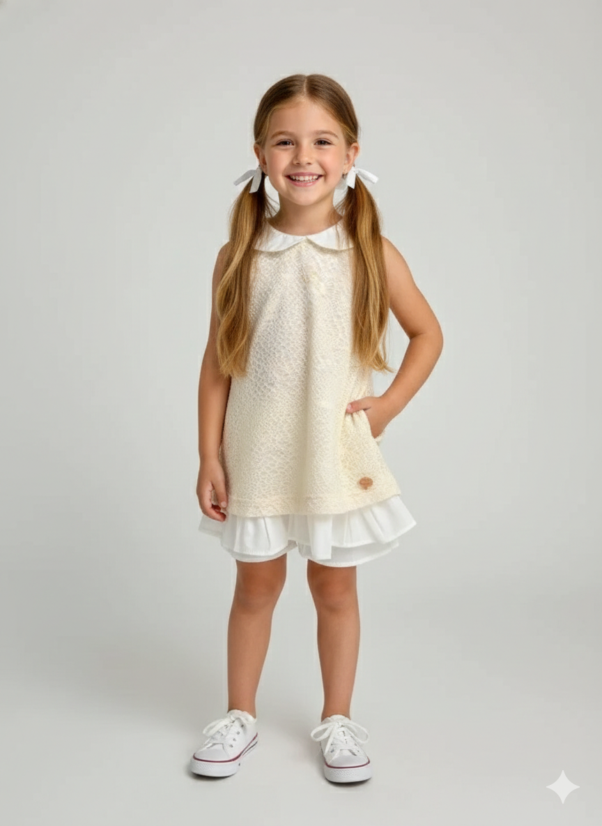 Tela de encaje de algodón con cuello baby en los talles de bebes hasta el talle 6A. Un clasico vestido que va con todo.Atemporal, te permite agregarle remeras o camisas abajo