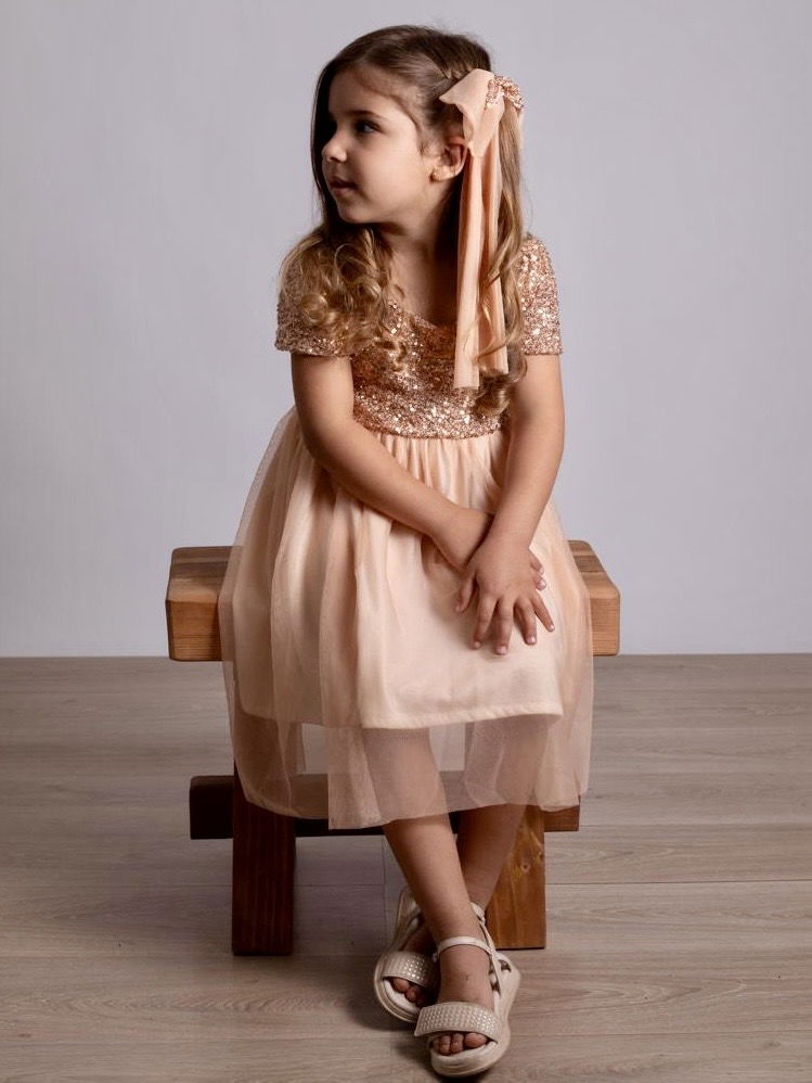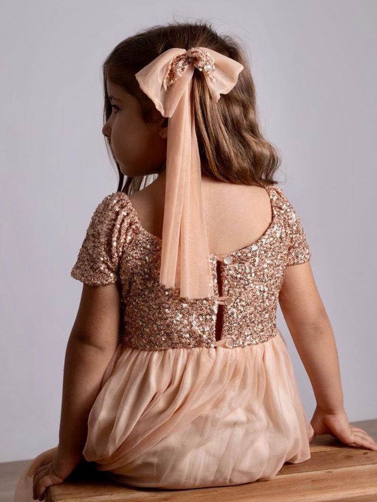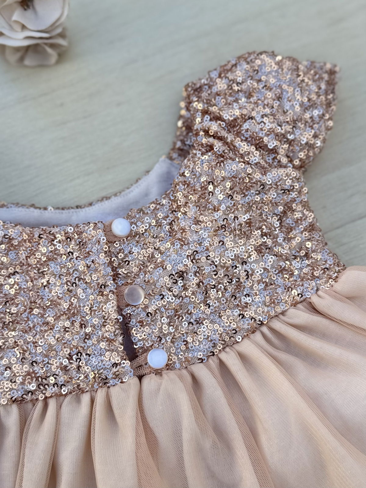 Vestido de lentejuelas con microtull en tono rosa dorado. Con prendidura de botones de perlas