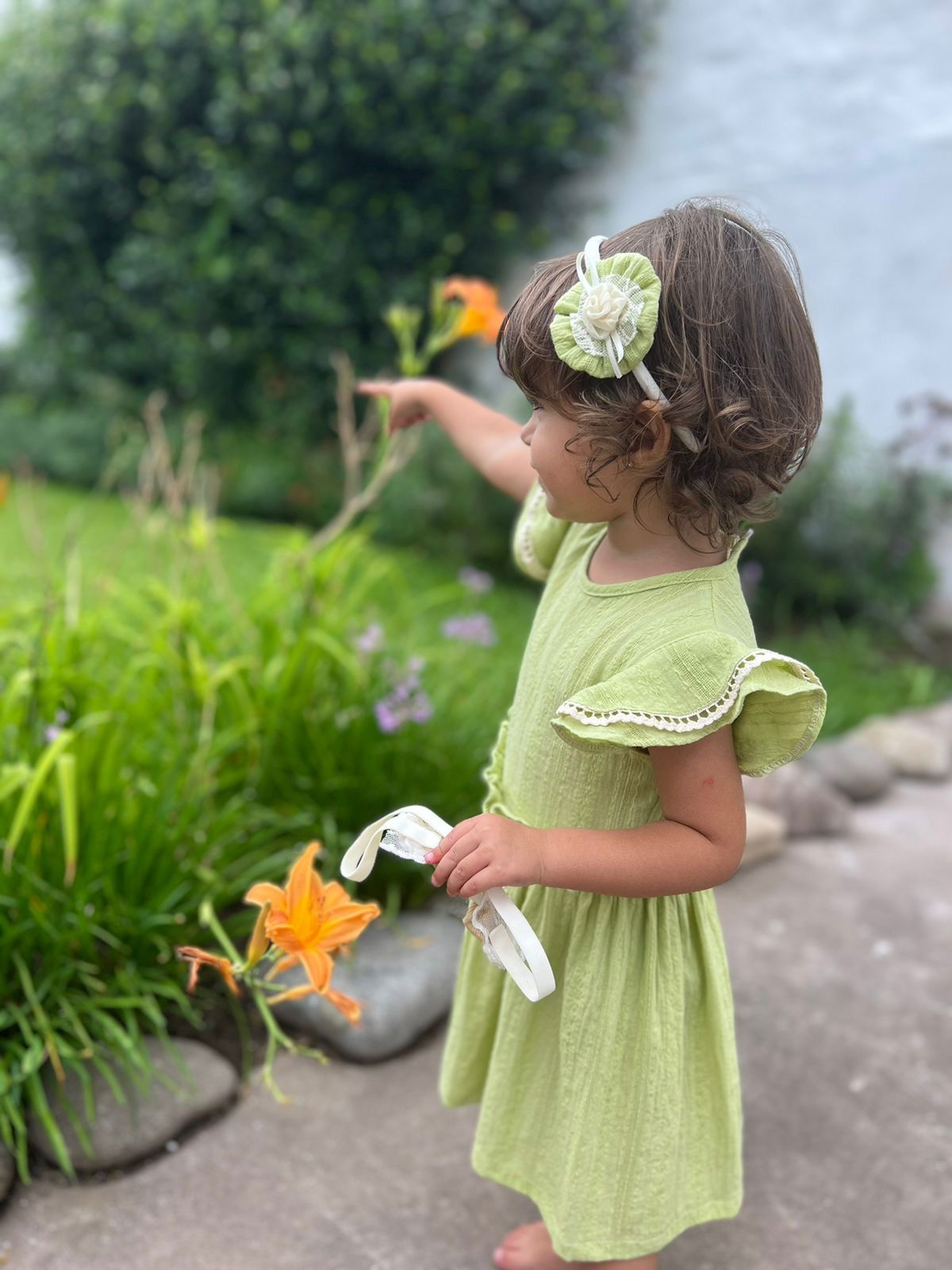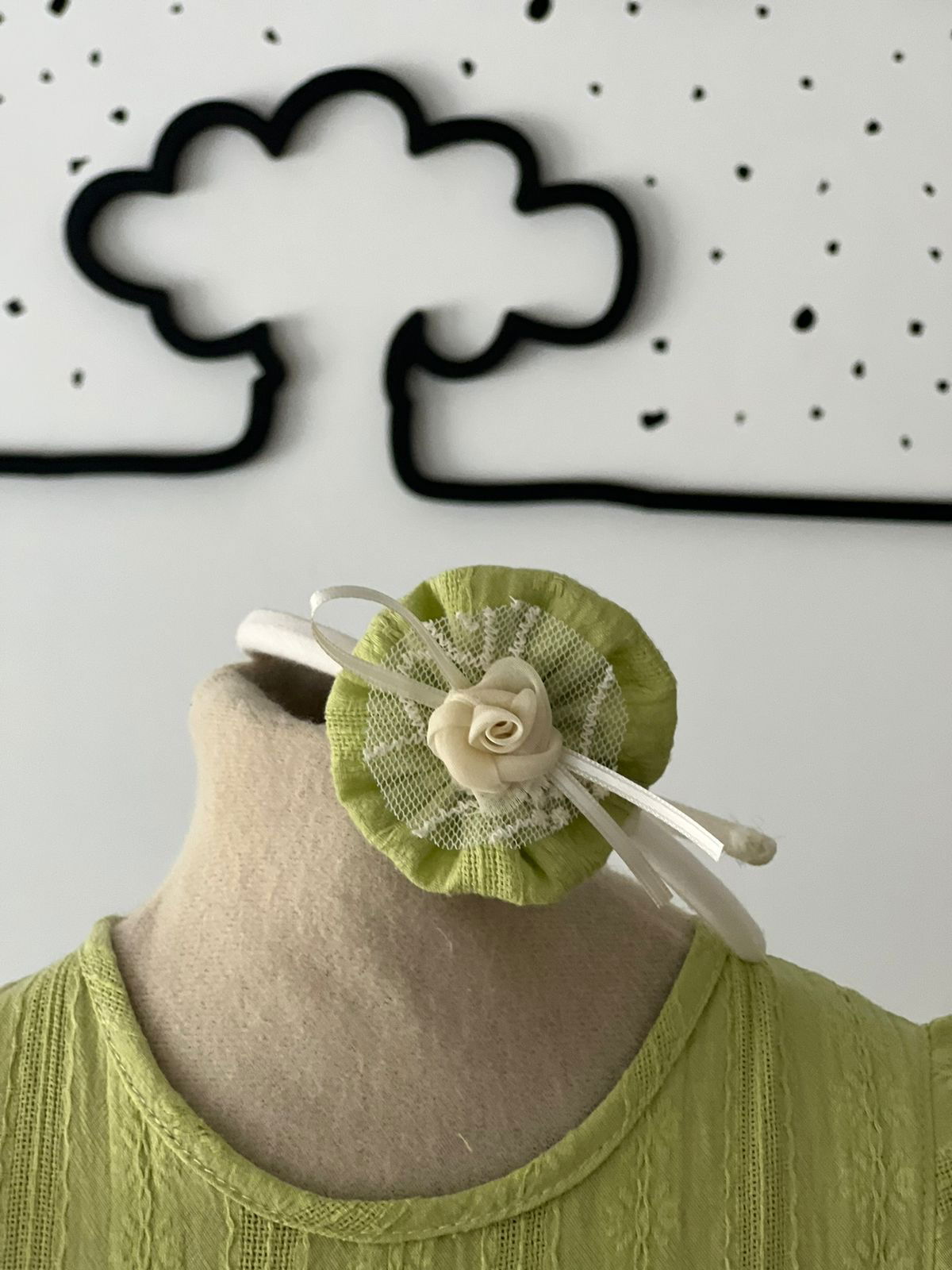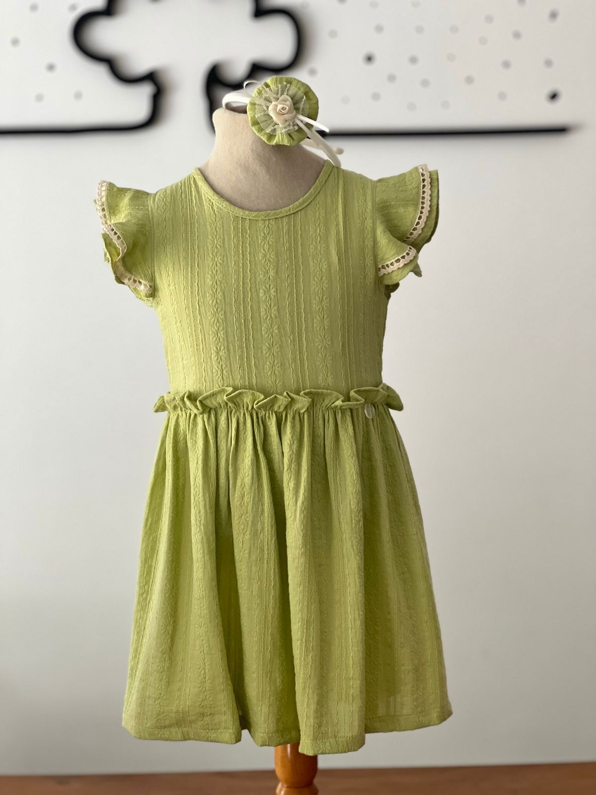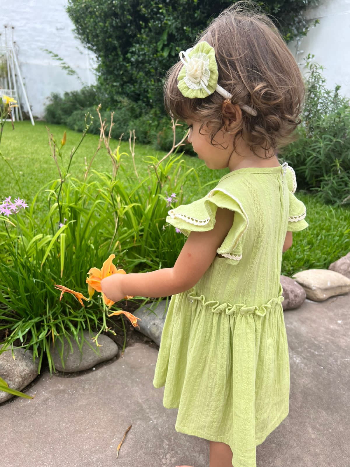 Vestido de voaile tramado color verde manzana con detalles en puntilla