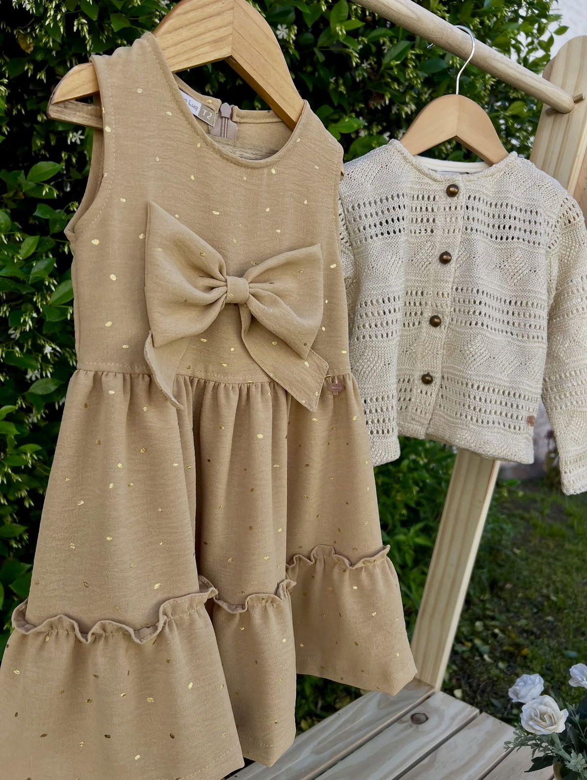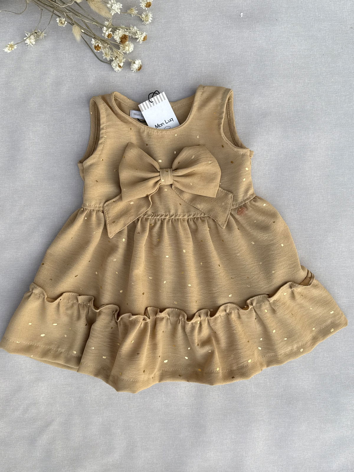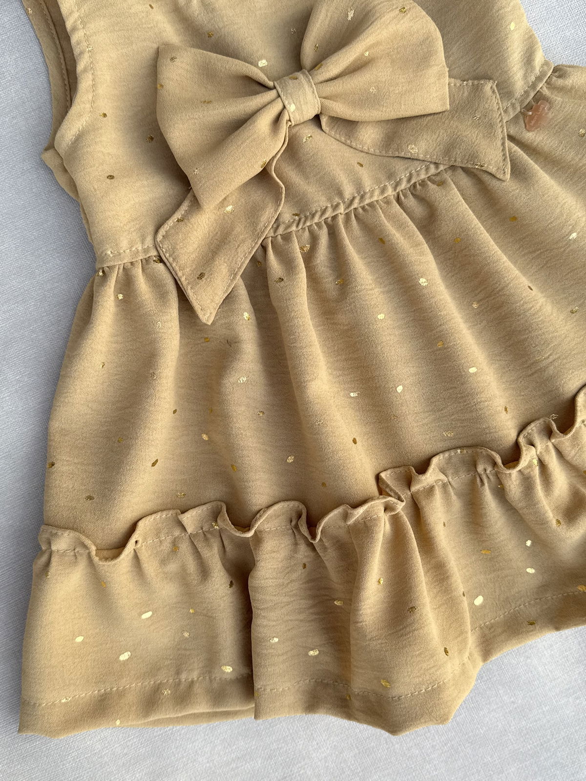 Vestido crepe dorado con estrellitas doradas y moño grande en su pechera