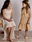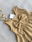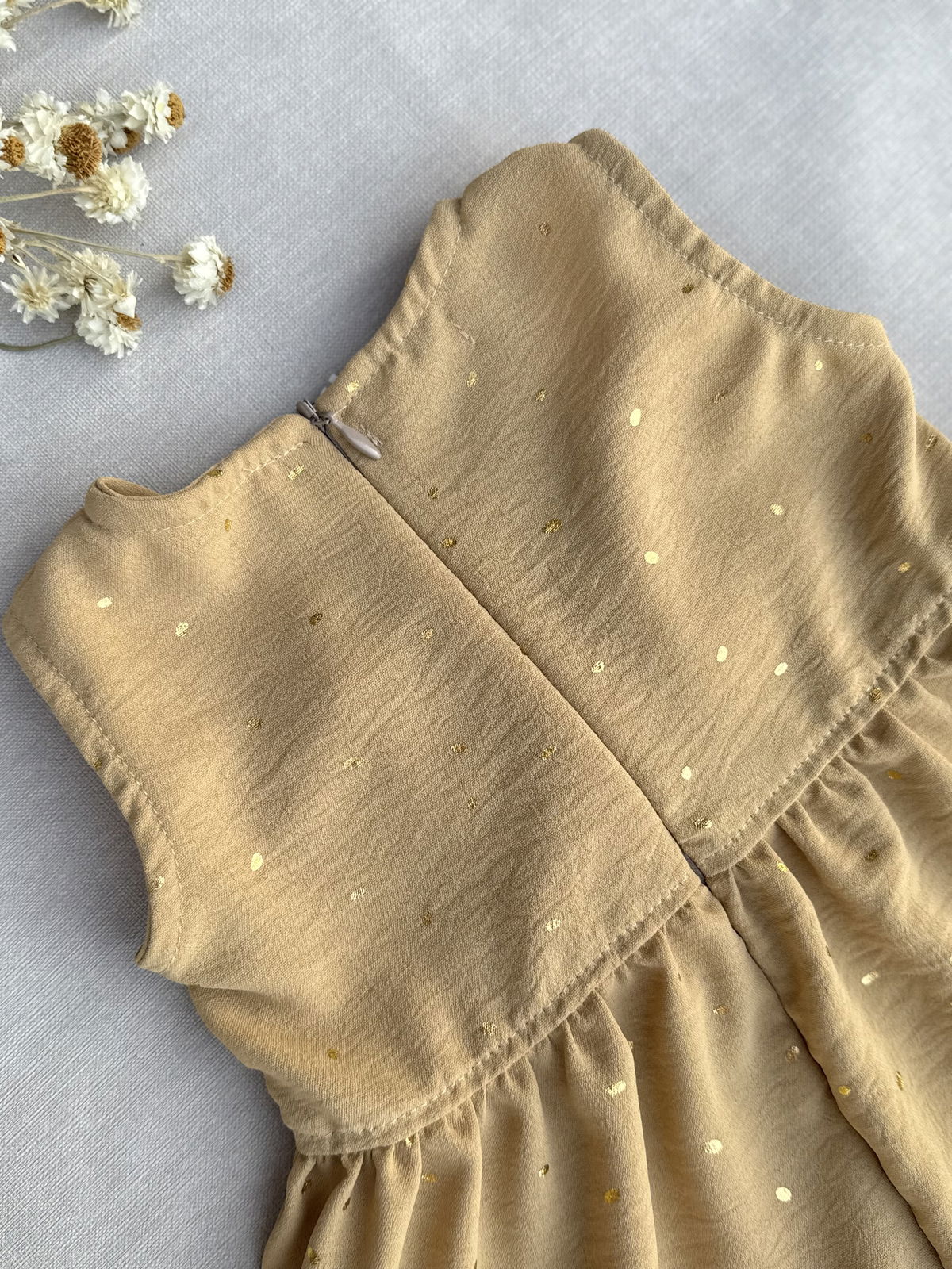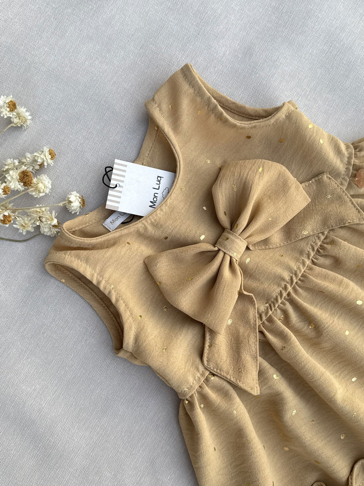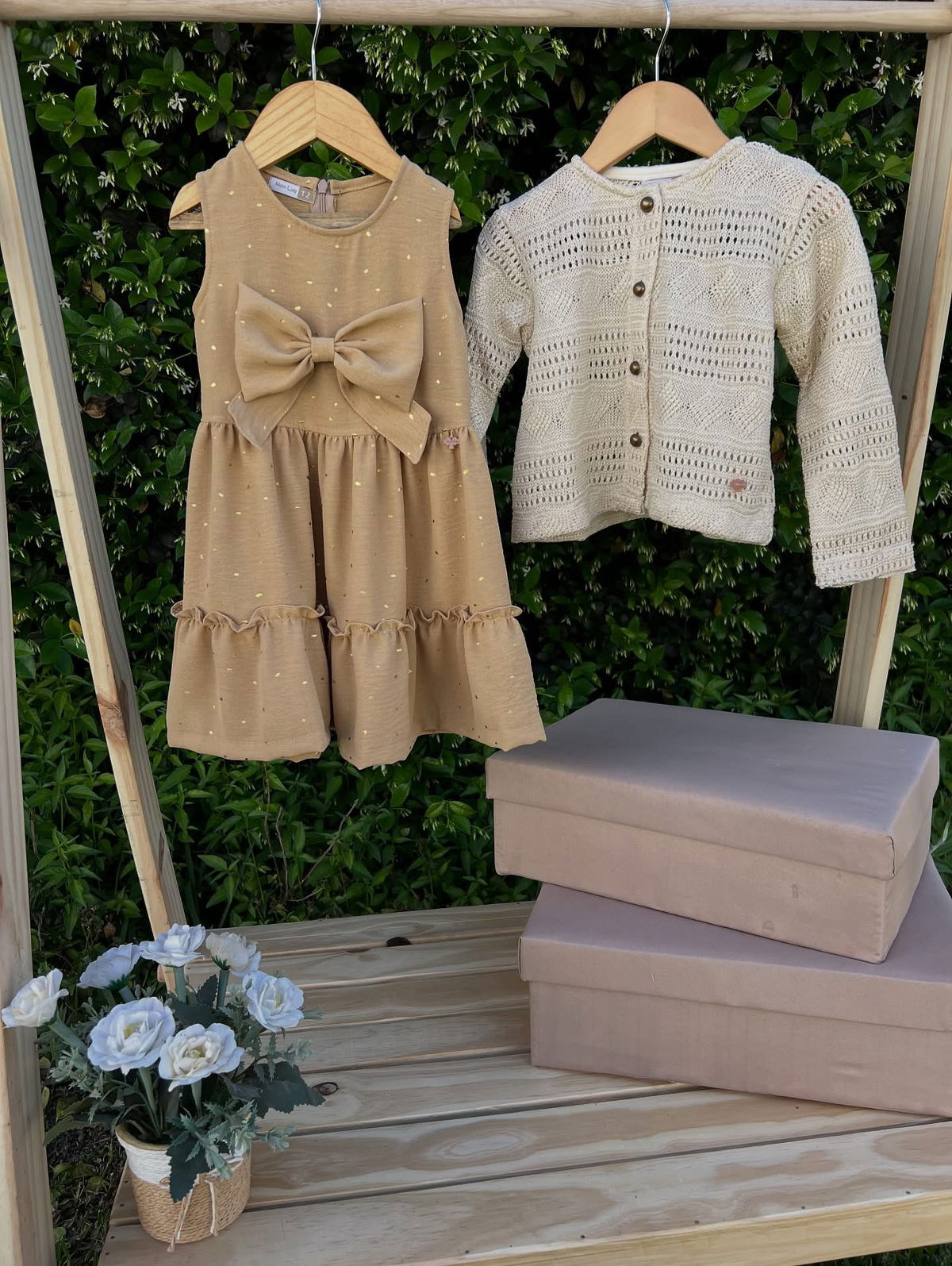 Vestido crepe dorado con estrellitas doradas y moño grande en su pechera