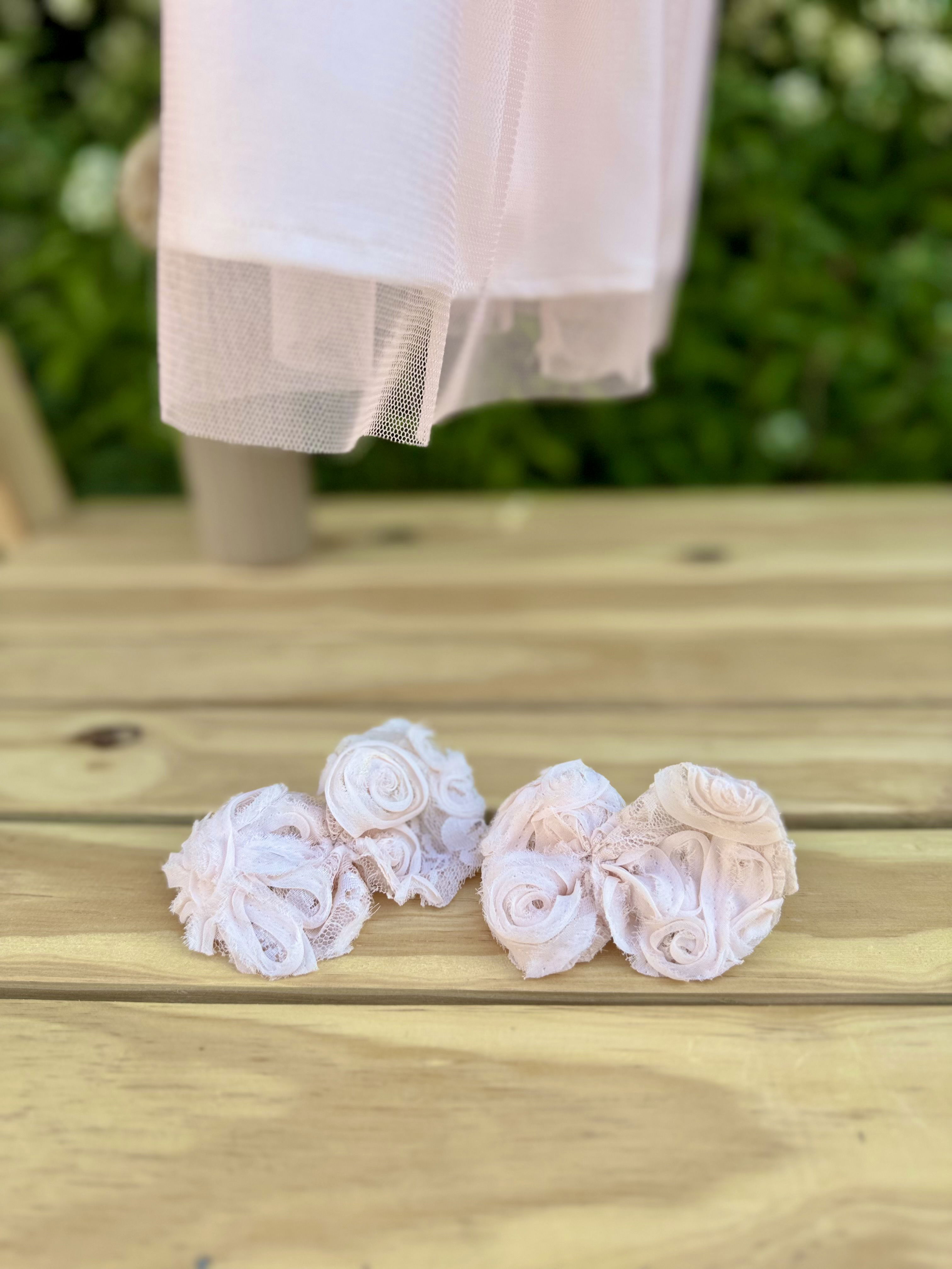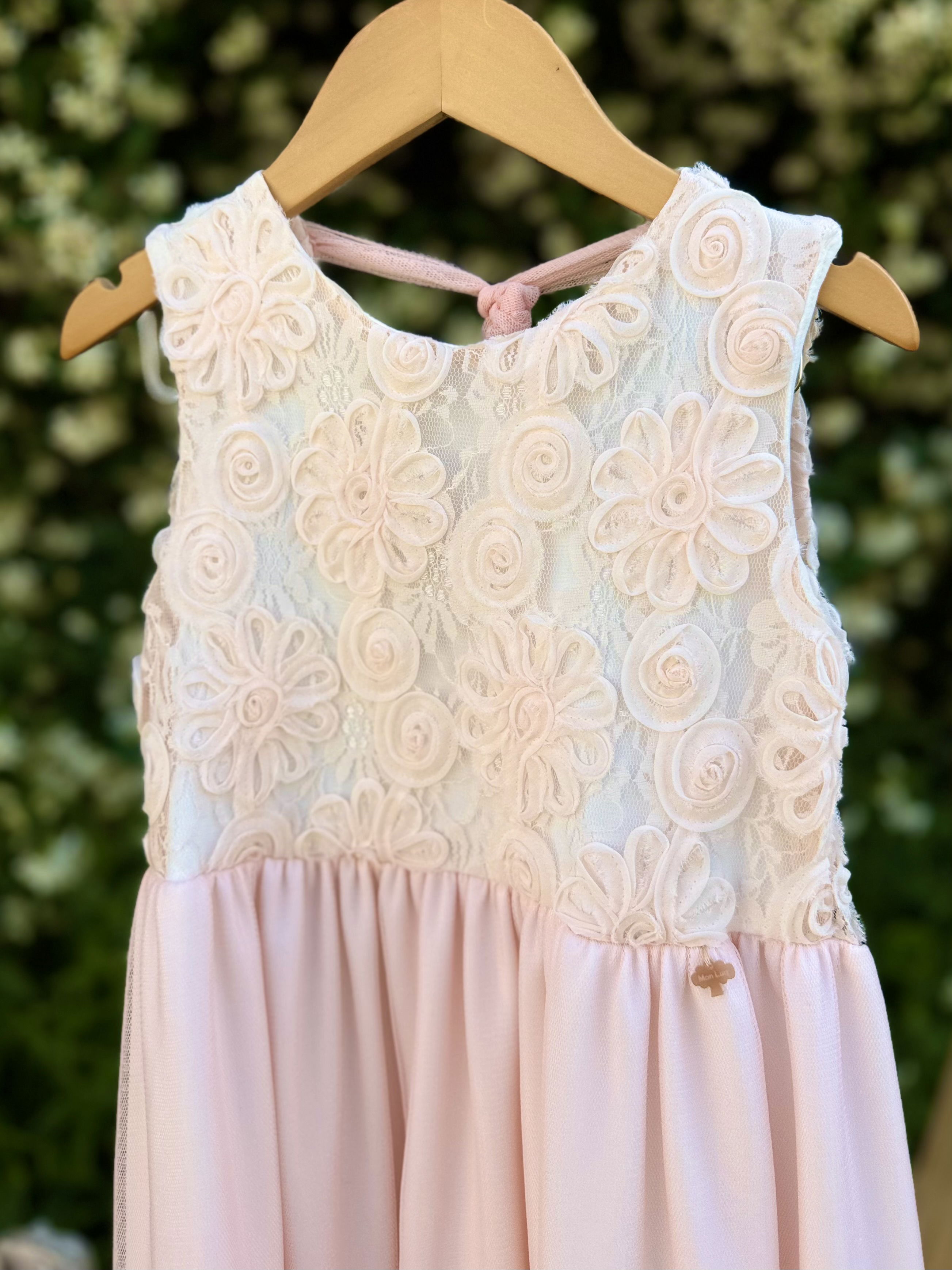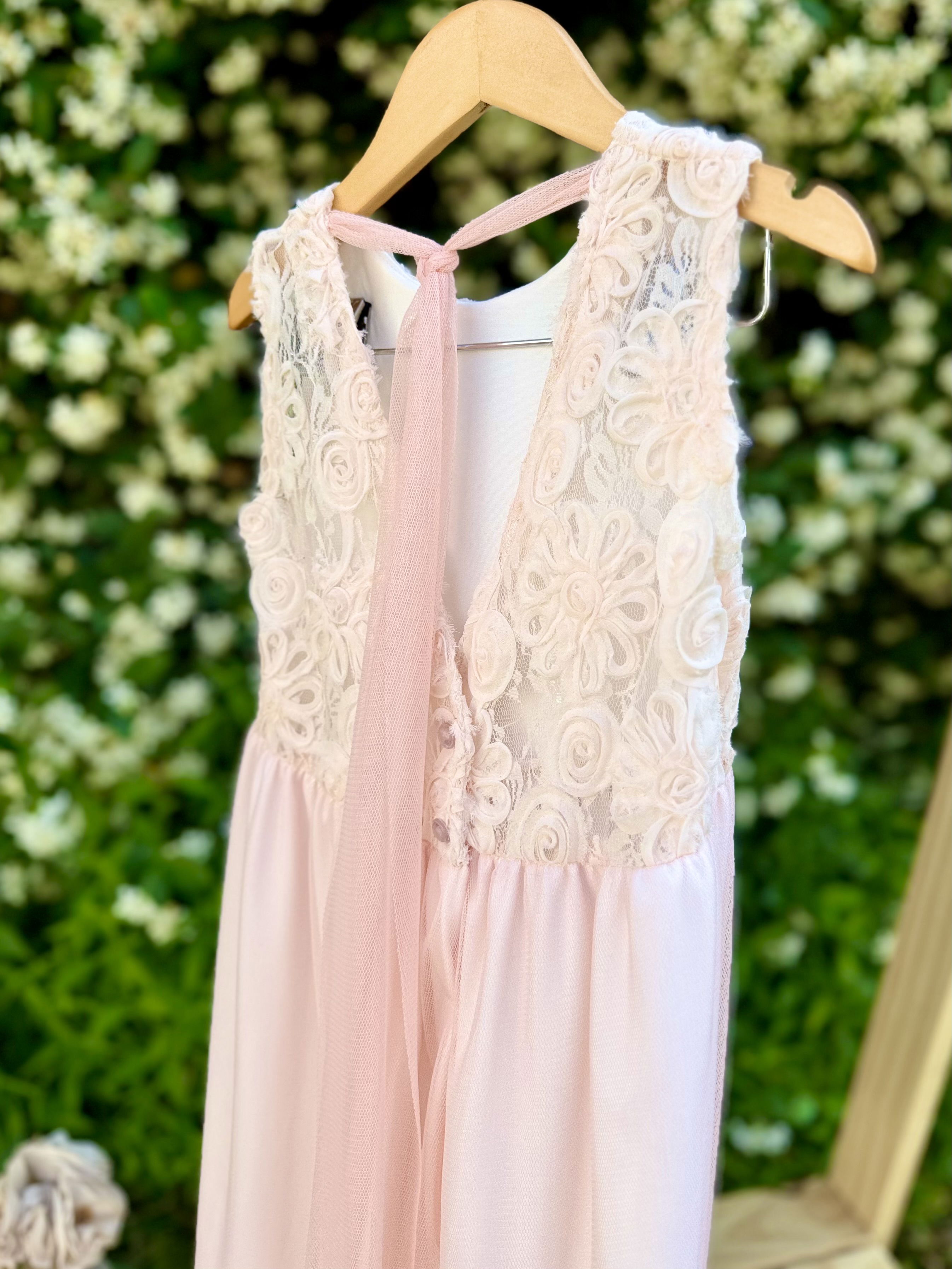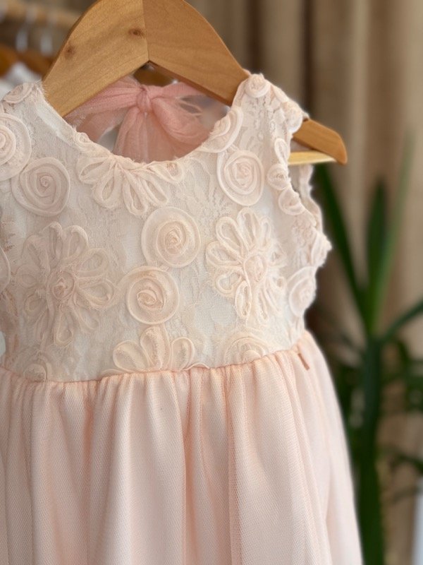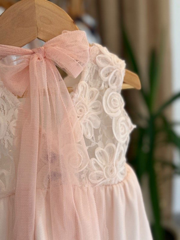 Vestido de microtull rosa suave con delicadas flores rococo en su pechera y lazo en su espalda
